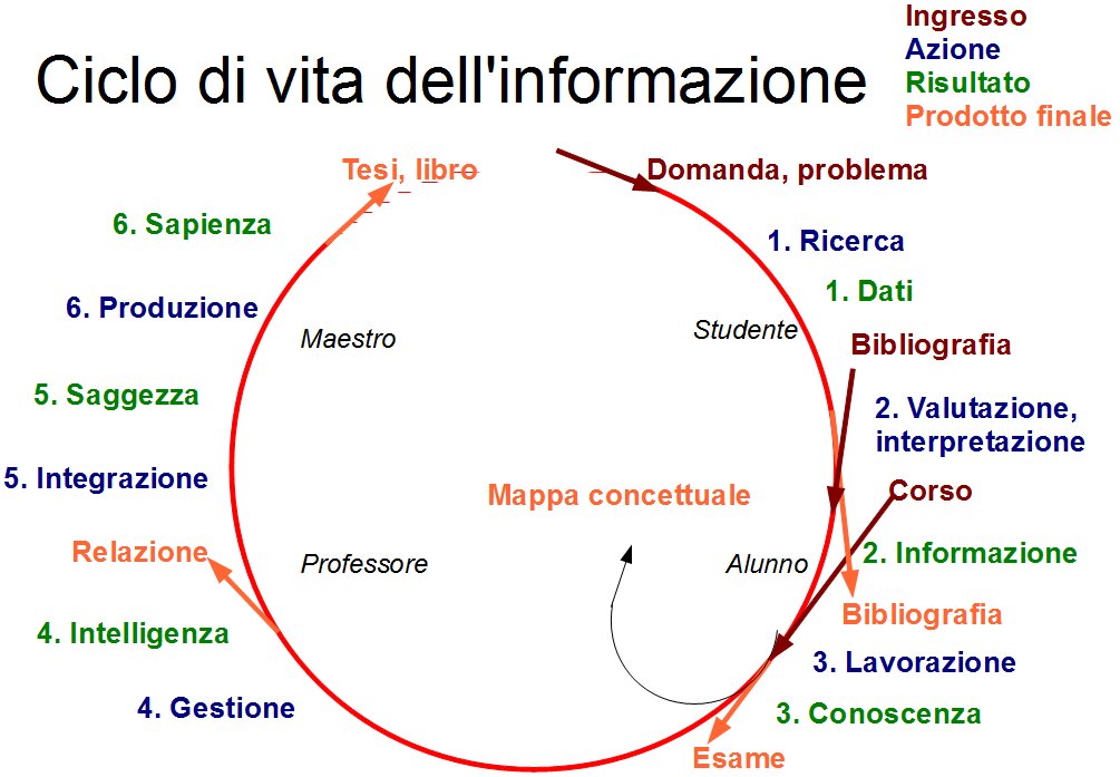 La vita dell'uomo è da sempre legato all'informazione e al sapere. Le modifiche alle tecniche di memorizzazione dell'informazione hanno cambiato profondamente la vita sociale. Dalla trasmissione orale e conoscenza legato al singolo individuo si è passati al sapere affidato ad oggetti come pietre, tavole di cera e in seguito papiro e pergamena. Questi ultimi avevano il vantaggio di potere essere trasportati e in questo modo l'informazione non è più legato al luogo in cui è prodotta, ma può "viaggiare": nasce la comunicazione a lunghe distanze. Le strade imperiali erano arterie comunicative vitali per la vita della società romana. Oggi il mondo dell'informazione e delle (tele)comunicazioni è talmente evoluto che ha portato ad un cambio di cultura o anche di civiltà. Fatti ed eventi producono informazioni che prima non erano nemmeno presi in considerazione, ma che oggi rivelano propensioni, gusti, profili, personalità, devianze, intenzioni, progetti, relazioni sociali... e la facilità di memorizzazione, accumulo, confronto ed analisi di questi dati porta a nuovi centri di potere. Infatti, il mondo contemporaneo e le società avanzate sono caratterizzate dall'importanza dei dati (codice per la protezione dei dati personali...) e dell'informazione. Informazione è un termine ampio che non include soltanto articoli, libri o testo in generene, e nemmeno un telegiornale o un quotidiano, ma qualsiasi evento della realtà che viene registrato (creando "dati") per essere in seguito utilizzato (creando informazione e conoscenza). Esempi sono il telefono e il cellulare, la navigazione in rete, le riprese delle telecamere di sicurezza, ma anche le fotografie dei turisti, fino a Google Streetview e servizi simili. La conoscenza della rete sociale permette di "inquadrare" una persona e può essere usato e sfruttato per il bene e per il male. Questo porta all'esercizio di un servizio o di un potere: sapere è potere. Nella vita quotidiano creiamo quindi costantemente informazioni, più spesso in modo inconsapevole che intenzionale. Partendo da queste riflessioni generali, urge insistere sulle nuove competenze (information literacy) per (soprav)vivere in questo "brave new world" perché si profilano nuove situazioni e nuove patologie: il problem solving, la ricerca di informazione, l'indigestione informativa, la notizia falsa,... Lo schema seguente ci può aiutare a collocare alcuni aspetti del discorso.